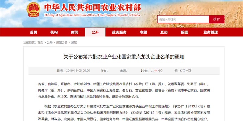 12月3日,农业农村部、国家发展改革委、财政部、商务部、中国人民银行、国家税务总局、中国证券监督管理委员会、中华全国供销合作总社联合印发通知,公布第六批 299 家农业产业化国家重点龙头企业名单,龙江澳门大阳城(集团)有限公司官网公司榜上有名。